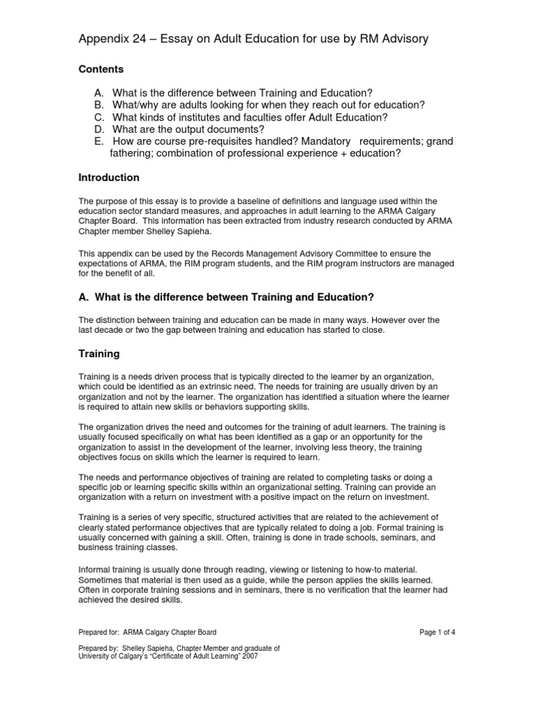 Adult Education Essay. Words2 Pages. Community Based Adult Education. A. Global Assessment of Community Based Adult Education. This includes most important contributions they can make to society in the face of what are considered the most significant challenges of the 's Concentration in Adult Education. In either the thesis or directed study option, students may complete a concentration in Adult Education. As part of the required core courses, students must take ESTU (3 credits) and three 3-credit courses chosen from adult education topic · Adult education has two branches. One can be called the purpose of education and the other can be named the practice of education. Many times it happens that in a practical set up the difference between the purpose and practice of adult education results in some sort of tensions in